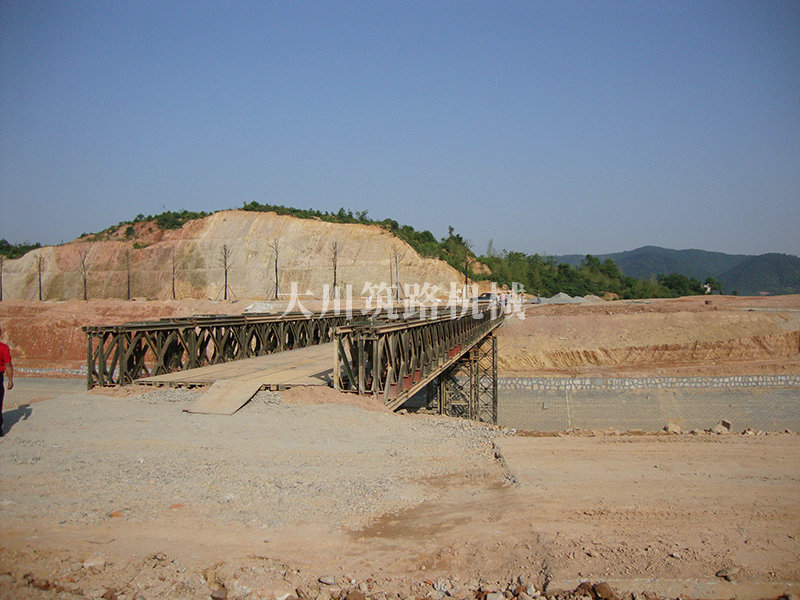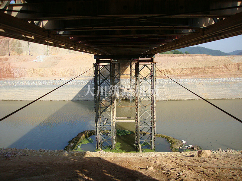 特點:本鋼橋由國防科技大學(xué)全程指導(dǎo)和監(jiān)督安裝,滿足荷載80T施工車輛通行,因施工場地要求,采用貝雷梁組合式橋墩,安裝拆除方便,穩(wěn)定性好。采用推出法安裝,安裝周期20天,于2011年5月25日通車。