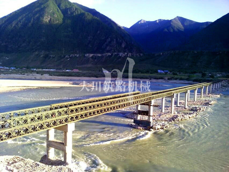 特點(diǎn):本鋼橋拉薩到林芝鐵路控制性工程的重要組成部分,滿足荷載80T施工車輛通行。主河道水流急,橋墩高,經(jīng)多方多次論證和設(shè)計(jì),最后采用了24+24+24+42+42+24M三排雙層單層混合型加強(qiáng)型雙橫梁下承式鋼橋。克服了施工難度大、氧氣較稀薄等因難因素,采用推出法安裝,于2015年6月通車。